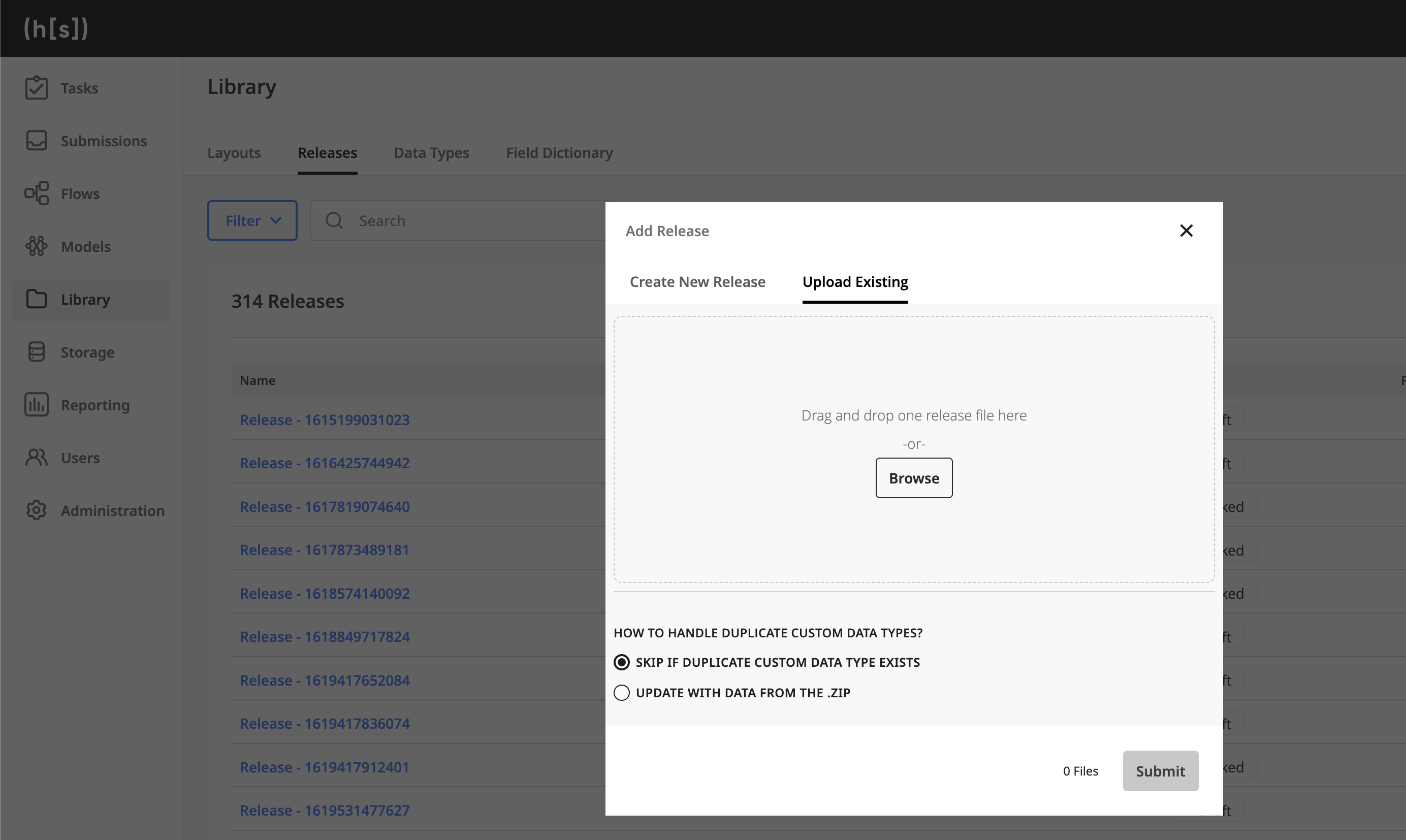 https://{hyperscience-url}/layouts/releasesand click Add Release. Select Upload Existing and choose therelease.zipincluded in the IDP Starter Example package. After a moment you should see the release uploaded to the Hyperscience Platform.